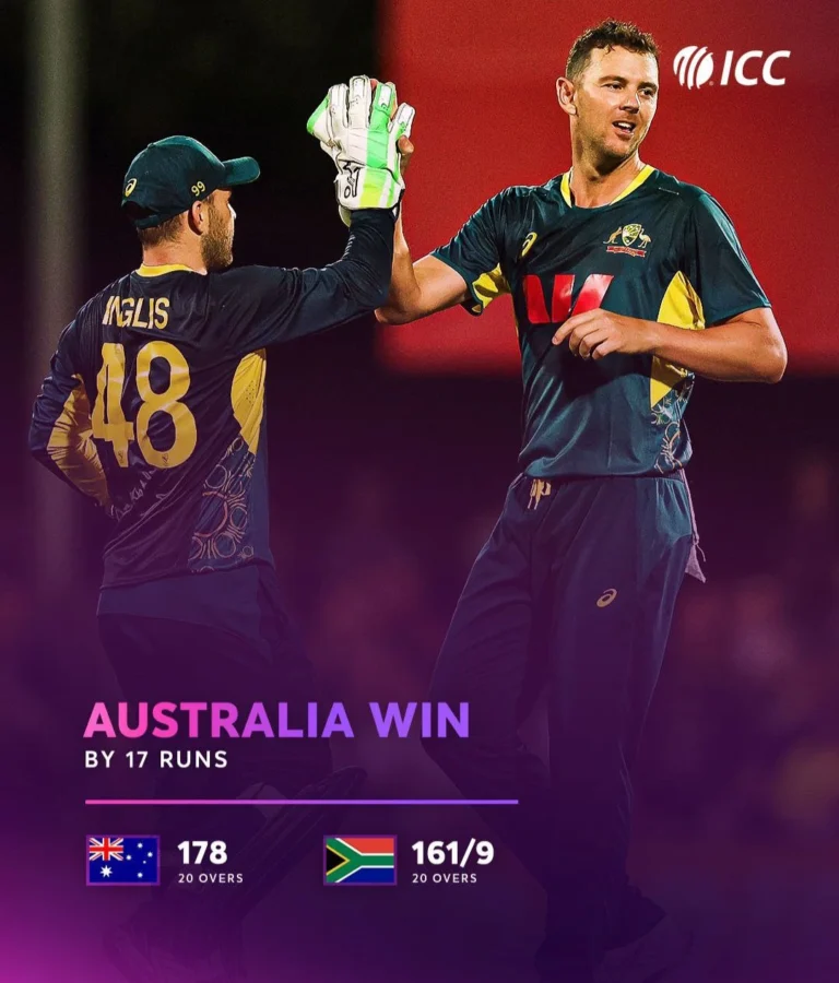 ऑस्ट्रेलिया बनाम साउथ अफ्रीका पहले T20I में Tim David की विस्फोटक बल्लेबाज़ी, Josh Hazlewood की घातक गेंदबाज़ी और Glenn Maxwell के ‘Catch of the Century’ से ऑस्ट्रेलिया ने 17 रनों से रोमांचक जीत दर्ज की। मैच की पूरी हाइलाइट्स यहां पढ़ें।