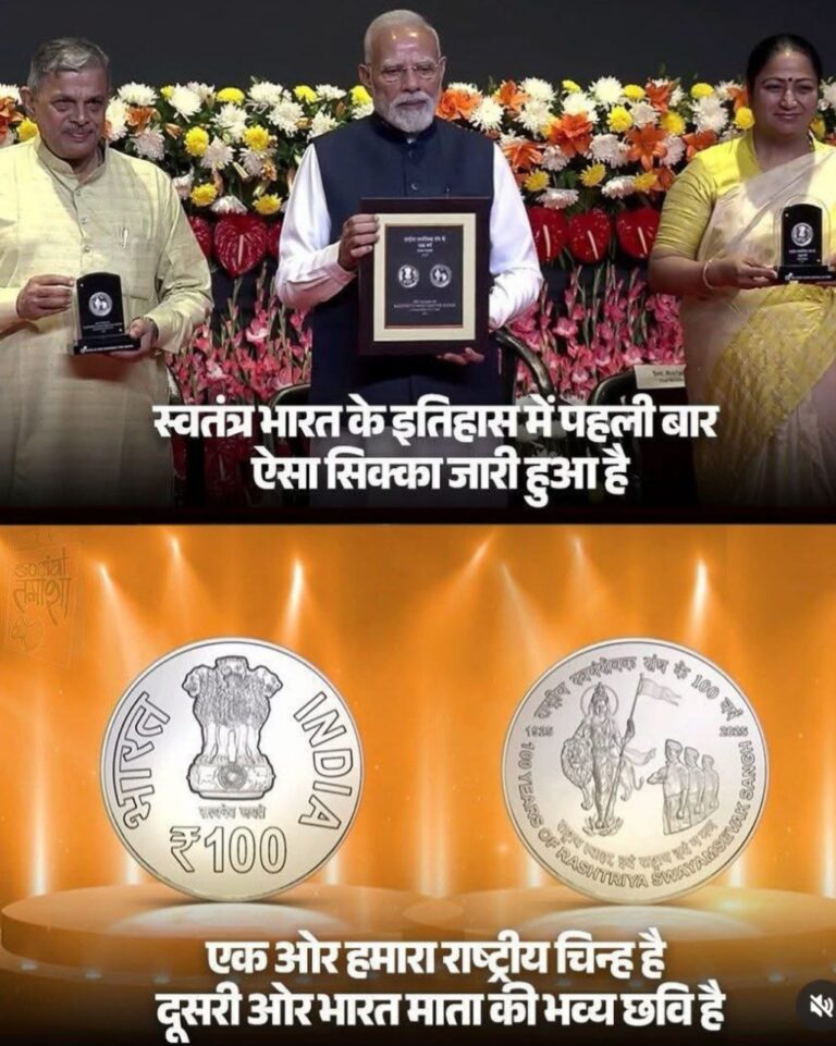 प्रधान मंत्री नरेंद्र मोदी ने RSS की स्थापना के 100 वर्ष पूरे होने पर 100 रुपये का स्मृति सिक्का और डाक टिकट जारी किया। इस कार्यक्रम ने विजयादशमी के दिन विशेष महत्व प्राप्त किया। सिक्के पर भारत माता की तस्वीर है, जो देश की सांस्कृतिक चेतना का प्रतीक है।