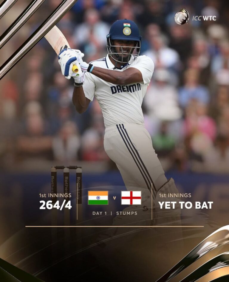 India ends Day 1 of the 4th Test at 264/4 vs England, with Sudharsan shining on debut and Pant retiring hurt after a quick 37. A solid start sets the tone for an exciting match ahead.