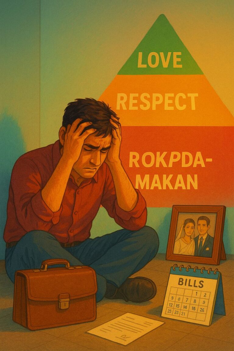 आधुनिक पुरुषों के मानसिक तनाव, रिश्तों, काम और पारिवारिक दबाव को दर्शाता चित्रण, जो भावनात्मक संघर्ष की गहराई को उजागर करता है।
